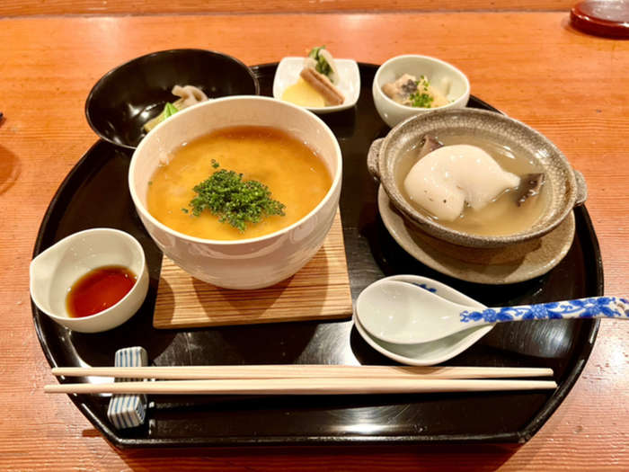 写真は小さなすっぽん鍋と雑炊を堪能できる「丸玉地ご飯 すっぽんと大根の鍋」。すっぽん鍋は甘めの出汁が美味しく、ご飯が入った茶碗蒸し「丸玉地ごはん」も絶品だとか。