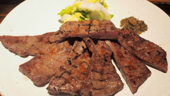 さっそく牛タンをいただいてみる。お肉は厚切りで、牛タンらしい弾力があり、旨味もしっかりあります。ただ、やや塩気がきつく、添えられてる唐辛子味噌をつけたら、かなり辛くなってしまいます。