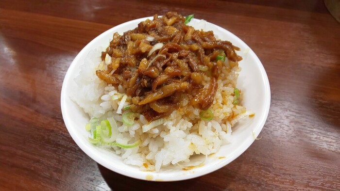 魯肉飯(500円税別)は、小さめの器にてんこ盛りされたご飯の上に、細切れにされた豚バラ肉の煮込みとみじん切りのネギが乗り、たっぷりの煮汁が掛けられています。