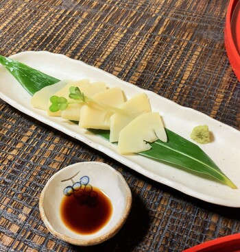 竹の子の刺身:要予約。軽く茹でてからスライスしてあるのかな?青臭さなどは全く無く、竹の子の自然な甘さがスッキリと美味しいです。山葵とも凄く合います。
