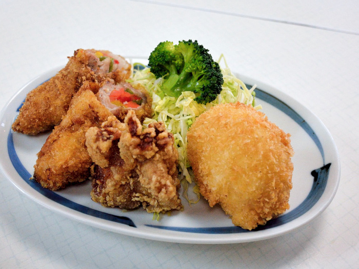 肉で野菜を巻いたフライ、鶏の唐揚げ、初めて食べた半熟卵のフライが盛られた揚げもの盛合わせと焼鮭をおかずに、ごはん小と味噌汁でマイ日替り定食を完成させました。旨かったです。揚げもの盛合わせの中にあった肉で野菜を巻いたフライに驚きました。何だ?味の中にピーマン系の風味を感じてフライを見るとパプリカが入っていました。これがワンポイント的に美味しさを出しているのだと思い、美味しく食べさせる術を知っているなぁと思いました。鶏の唐揚げも旨かったです。他を寄せつけないにんにく風味がありました。1個だけでも存在感アリアリの旨い唐揚げでした。半熟卵のフライは初めて食べました。フライを割ると黄身がとろッと出てきて、これまた旨いなぁと思いました。焼鮭は柔らかめな焼き加減で、揚げものと合わせてご飯をすすむ君にさせました。味噌汁はお揚げや野菜など具沢山で白みそ仕立てでした。