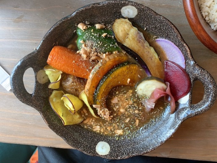 上記はハルサー(畑人)カレー。地元野菜等の素揚げがのった野菜カレーで彩りが良いですね。