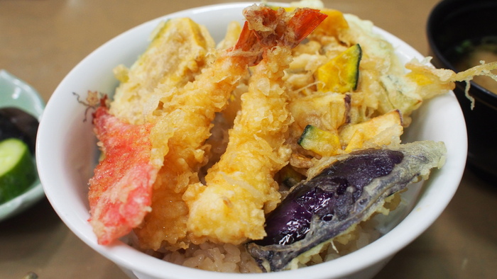 穴子1尾・海老2尾・牛肉1枚・豚肉1枚・餅・ちくわ・季節の野菜というほぼ全種盛りのような「ミックス天丼」(1,350円)は、お味噌汁、お漬物とともに差し出されます。