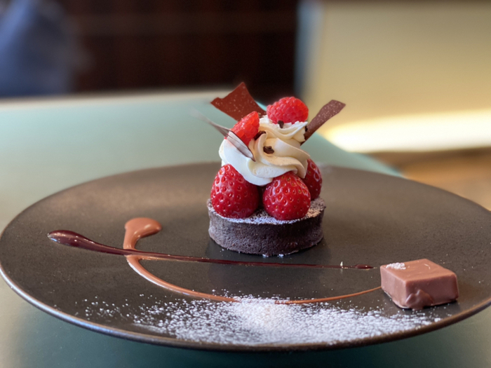 上に載ってるアイスはバニラかな?と思いきや柑橘系のさっぱりシャーベット。下の方はベリーのソース&バニラアイスにマンゴー?のソースがかかっていて甘酸っぱくておいしい?生クリームも甘すぎなくて全体的にさっぱりたべられました(*´ω`*)