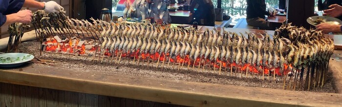 お店に入ってすぐのところで、沢山の鮎を炭火で焼いていて壮観です。