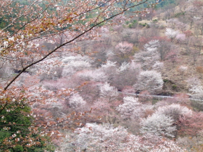 桜の季節になると、古来桜の多い、桜の名勝吉野は淡いピンクから濃いピンクまで、さまざまなピンクのグラデーションが山いっぱいに広がります。
