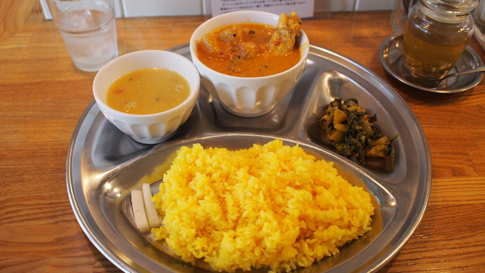 ダルとチキンカレーはステンレスの小鉢に満たされていて、チキンカレーはチキンがたっぷり入っていて食べ応えがある。