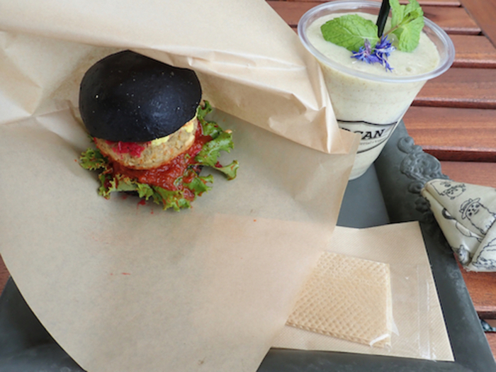ベジバーガー、パティは玉ねぎと玄米からなってるけど肉肉しく、竹炭入りバンズにお野菜があざやかで、都内とかのよりリーゾナブルなのがうれしいですミャ。