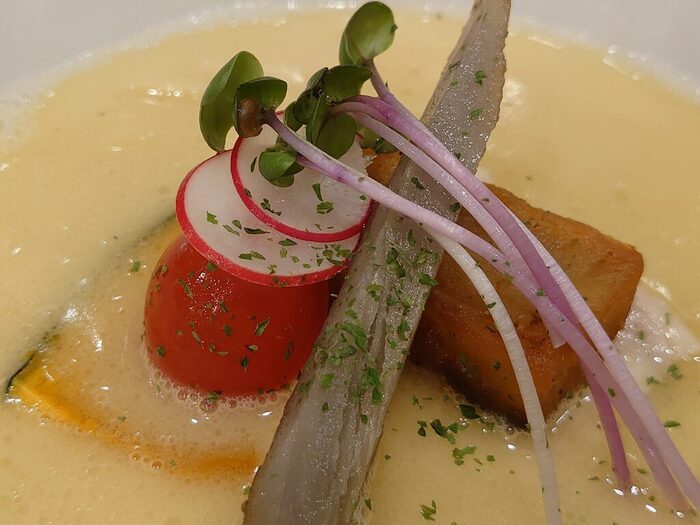 見た目は「コーンポタージュソープ」のような色合いで、中央の盛り付け部分も「ラーメン」とは思えない手の込んだトッピングです。