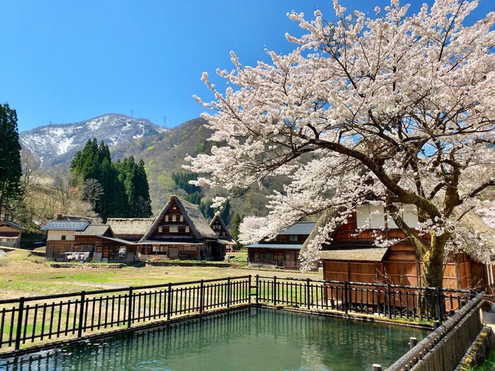 五箇山は標高が高いので、富山市内の桜が散った頃に、桜が満開になります。そこで、菅沼集落にお花見に行きました。桜の木の数は多くないですが、合掌造り集落と山と雪と桜を一緒に見る事が出来ます。