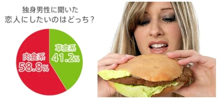 某ネット調査によると、20〜30代の独身男性(N=2363名)に聞いたところ、恋人にしたいのは肉食女子と答えた割合が過半数を超えたという結果が出ました。