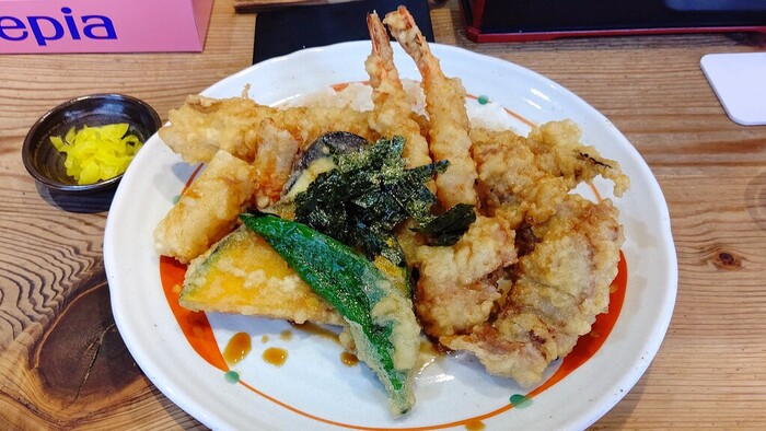 ご飯を覆いつくさんばかりに各種の天ぷらが盛られ、海苔がトッピングされています。これは壮観!