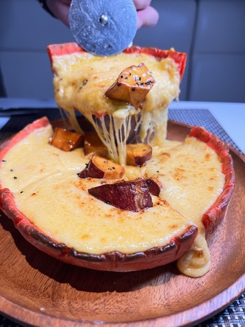 蜜の濃いさつまいもをペーストにしてオリジナルブレンドチーズと合わせたさつまいもシカゴピザはなんとチーズが300gも入っているこちらのシカゴピザ。