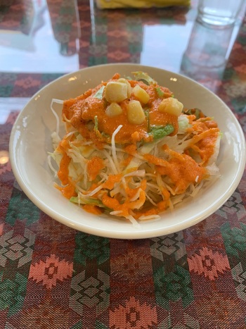 インディアンカリーのお店に入ると、なぜかネパール国旗が飾ってあるお店が多いですね。そして、謎の(⁉)黄色かオレンジ色のドレッシングのかかったサラダが印象的です。