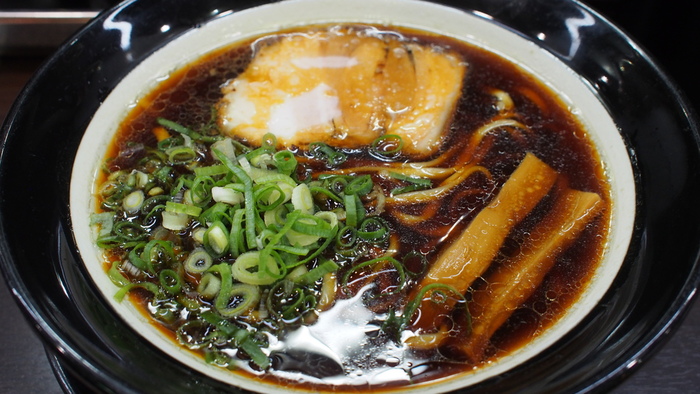 醤油の真っ黒いスープに泳ぐ極太ストレート麺は、もっちりした食感で饂飩のよう。適度なコシを持ち、特徴的なスープに負けないほどの存在感を主張しています。