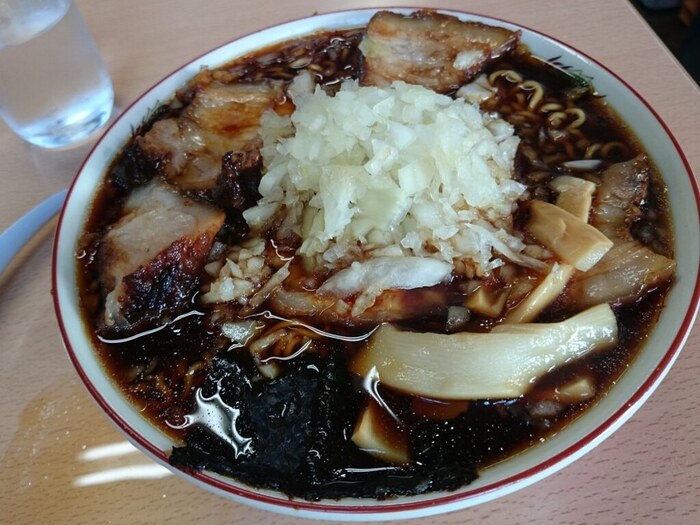 スープの色はかなりブラックですが見た目ほど味は濃くなく、「乾麺」「チャシュー」「タマネギ」の組み合わせが旨いです。