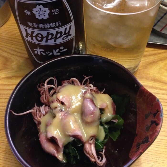 「わたらい」で軽く喉を潤した後に訪れていた「馬越」こちらはコの字カウンターの座って飲むお店。金宮25°のボトルを入れてホッピー飲んでました。こちらのお店もお昼の2時から営業って店員さん大変ですよね(^◇^;) ご苦労様です。「わたらい」「馬越」って店員さんに由来を聞いたら何でも社長の小さい頃の駄菓子屋さんの店名だそうですw