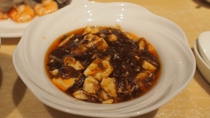 麻婆豆腐をひとさじ口に運ぶと、豆板醤による辛味が一気に襲ってきて減衰するが、山椒の痺れはあまり感じません。しかし深いコクが感じられます。これは豆鼓醤によるものかも。