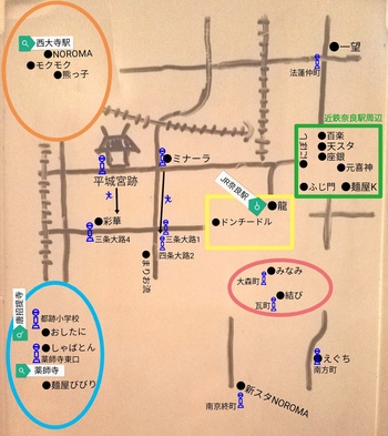 平城宮跡朱雀門へ、ミナーラ前の大通りを西(右)へ800m、そこから南西方向へ徒歩500mで後述Ⅴ「彩華ラーメン」