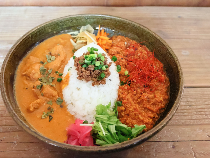 【いりこ出汁のチキンカレー、淡竹のポークキーマ 2種あいがけ】