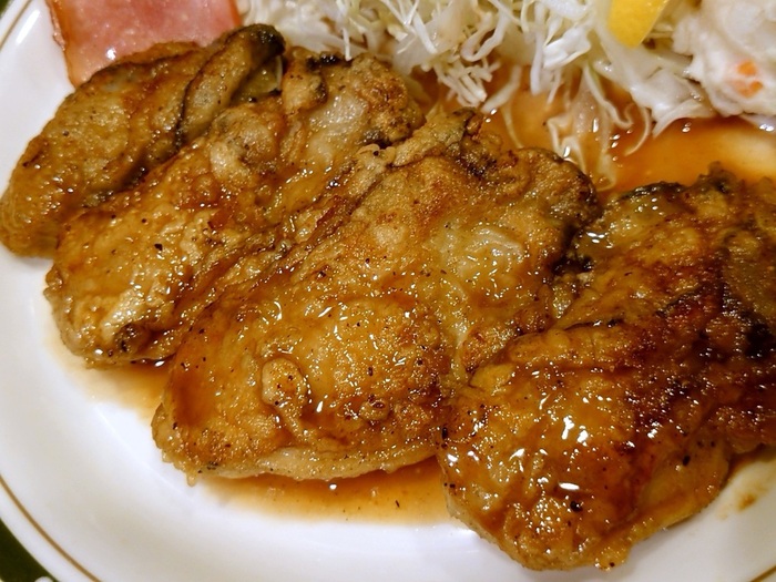 『カキライス(ソテー)』は、「唐揚げ」色の小麦を纏った普通サイズの「牡蛎」が5個のっています。食べると小麦粉に絡んだ醤油ベースの焦げた部分が香ばしくて美味しいです。全体的に「プロの味」ではなく「家庭の味」を再現しているスタイルでボリュームはありませんが、比較的安価に「カキバター焼き」を楽しめる店です。