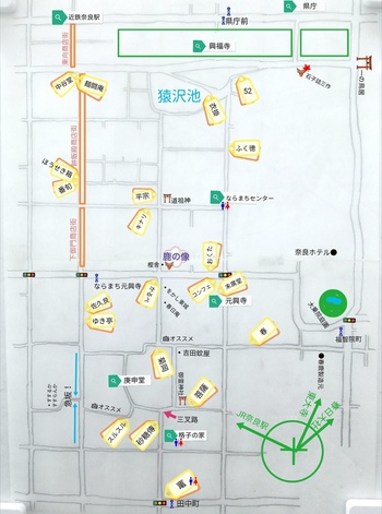 本稿では、午前中または午後に「奈良町の南端、田中町バス停から北上するルート」を紹介していますが、