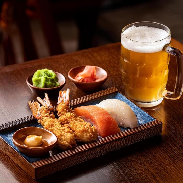 木のカウンター席をメインにした店内は海小屋風で活気ある雰囲気。創作メニューもある寿司と魚介の一品料理を提供。泡盛やワインもある。