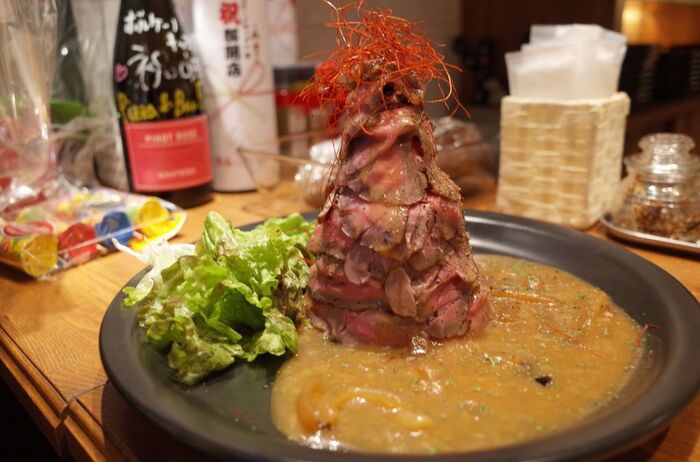ローストビーフ山盛りの中にはご飯、ゆでたまご1個が入ってて、トップには名前の通り、火山の噴火のように糸唐辛子。