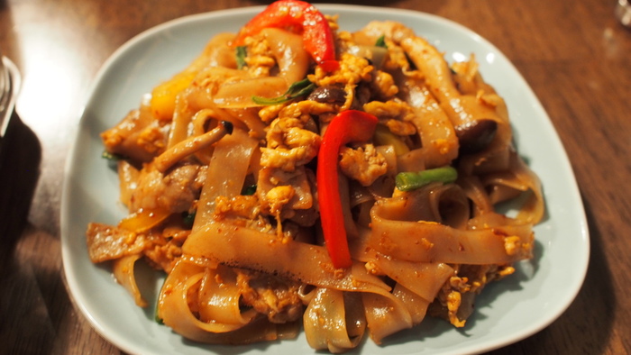 麺は平打ち麺で中華の炒麺とは風合いが異なる。野菜は葱、玉ねぎ、ピーマン、パプリカといったところ。