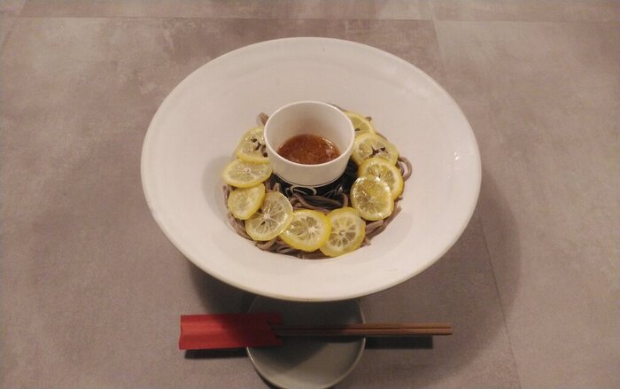 次の写真は、あまりにも衝撃的だった『月山』さんの“塩漬けれもん胡椒つけそば”です。ムーンライトに乗せて味逢ってください。かみしめる蕎麦です。かなり辛いですが、超お薦めです。