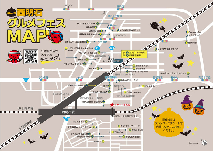 西明石の街を舞台に、地元グルメと人の温かさに出会える食べ歩きイベント。和食・洋食・中華・カフェなど36店舗が参加し、各店自慢の一品とドリンクをチケット制で楽しめます。仮装での参加も歓迎され、ハロウィンの雰囲気とともに街全体が盛り上がる2日間。食を通じて地域の魅力を再発見!