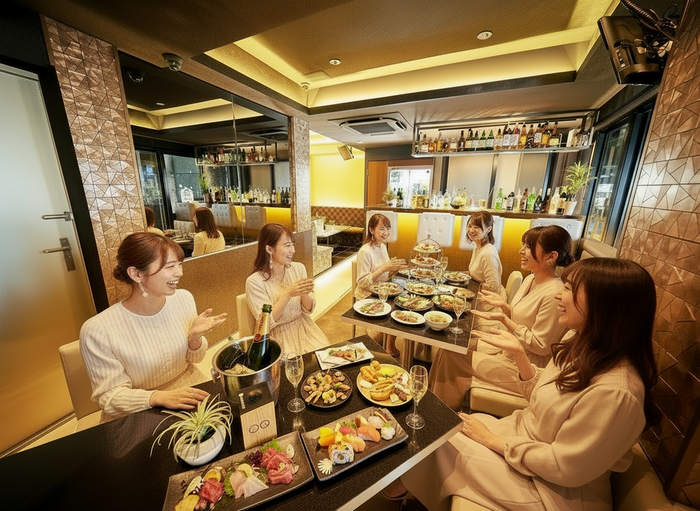 シェフ手作りビュッフェと専属バーテンダーが作るドリンク、更に大型プロジェクターやシャンパンタワーも完備で結婚式二次会、飲み会、合コン、誕生日会などに最適!!