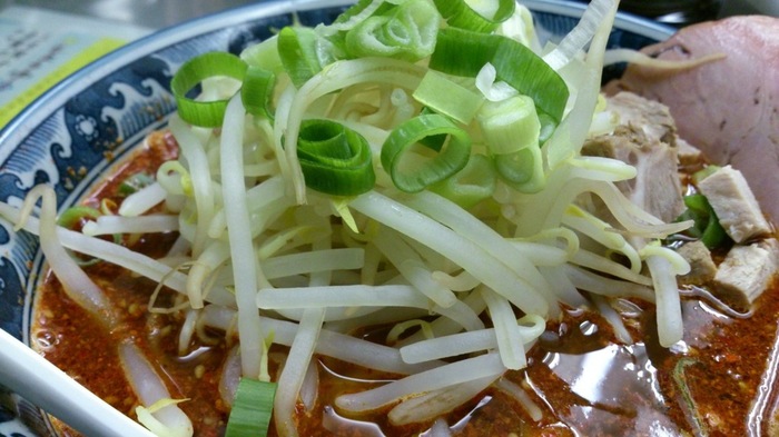もやしの白と赤いスープのコントラストが美しい!