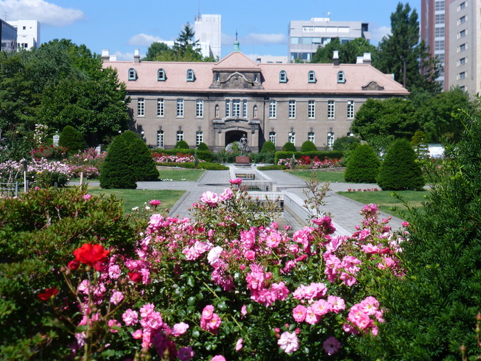 下の写真は、札幌の大通公園の「バラ園」です♪奥の建物は、国の登録有形文化財に選定された「札幌資料館」。