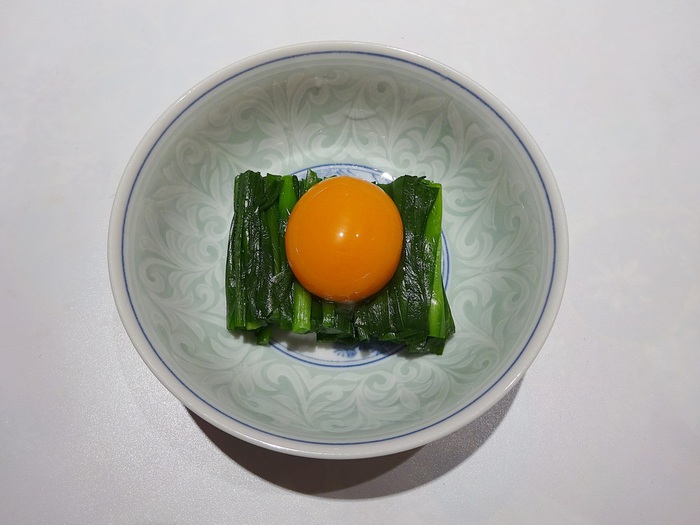 ニラのおひたしに卵黄をのせたタイプもあるけど、私はまだ出会えてないので、自宅で作ってみました♪
