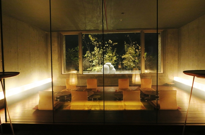 縄手通り沿いの1本南を東に折れたお茶屋さんが点在する風情を残すエリアに位置します。趣きある路地を抜けると中庭。お茶室まで揃い奥はスタイリッシュなカウンタースペースとなっています。