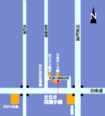 明治時代に花遊軒という精進料理のお店がここにあり、その後にできたのがこの商店街です。 昭和初期から中頃は、下駄屋、鬘屋さんなど多くあり、役者や女優また祇園に近いため舞妓や芸姑さん御用達の お店が沢山ありました。そして今でも昔から商う店が沢山健在しています。 ここの商店街は、京都一短い商店街でもあります。