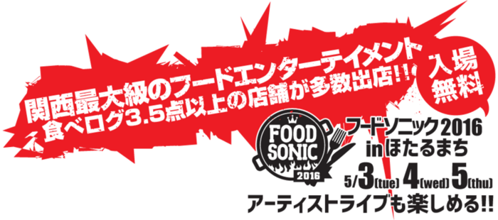 今年のゴールデンウィーク一番注目のフードエンターテイメントフェスティバル!大阪福島区「ほたるまち」で開催される「FOOD SONIC 2016 in ほたるまち Supported by SUNTORY & 食べログ」の気になるお店のまとめです。
