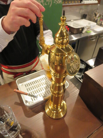 ビールホースの短さも旨く飲むための工夫。ビールサーバーから注がれる黄金色のエビス樽生。