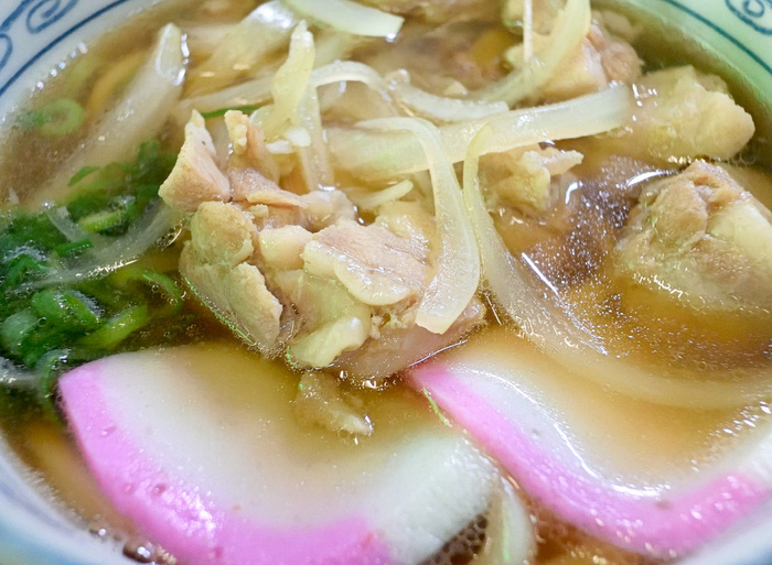 うどんは私の基準でやや細めの平たさもあるうどんでした。個人店特有の硬さを感じる美味しいうどんで、かけ出汁も美味しい味でした。鶏肉系のうどんを食べると、かけ出汁に鶏肉の出汁が加わったように思えて美味しく感じます。今回も美味しいなぁと思いました。ねぎは好みの合せ方で美味しく、おふもいい感じに味がしゅんでいました。飾り切りをした紅白かまぼこは老舗ならではのひと手間を感じました。
