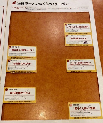 主な駅でゲットできるイベントの案内パンフレットはかなり良く出来ており、各店の特徴や麺類のビジュアルが把握できます。また、パンフレットに付いているクーポンの半数程度は味玉(煮卵、ゆで卵)ですが、代金の値引きや麺大盛り、チャーシュー増しなどのサービスもあります。いずれにしても、その名のとおり各店舗は駅から徒歩圏にあるので、公共交通機関ファンには最適なイベントと言えます。電車で行けば、お酒も飲めちゃいますしね。