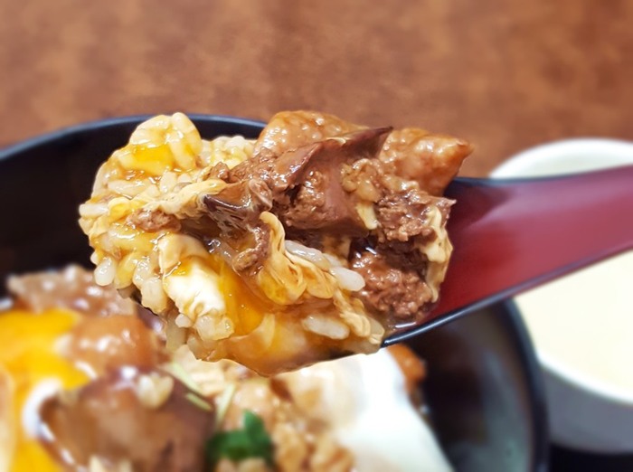 玉子はしっかり目にとじた上に黄身ONのスタ