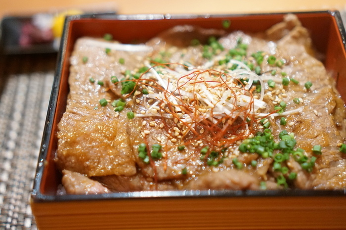 ランチタイムに訪れたならば「牛トロ重」はいかがでしょう。黒毛和牛の刺身部分を細かくし、自家製ニンニク醤油と新鮮卵黄と一緒に食べます。