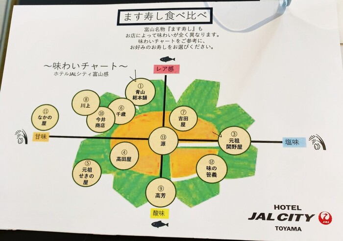 今迄食べたのは、青山総本舗・味処 真琴・味よし・有磯きときと庵・今井商店・植万・魚づ鱒寿し・大辻・扇一・小矢部川SA(隣接工場で製造)・川上・丸龍庵・銀兆(美人家)・笹寿司(射水)・笹義・順風屋・寿司一・すし幸・寿々屋・味の昔亭・せきの屋・元祖関野屋・千両・平ら寿し・大黒屋・高田屋(高岡市)・高田屋(富山市)・高芳・竹勘・味の匠味・多田屋・千歳・とと屋・味のなかだ・なかの屋・ニューオータニ高岡・紀雅・はりたや・ヒロ助・北水・山正・横田屋・吉田屋・前留・まつ川・丸高寿し・源・米久(よねきゅう)・若廣の49軒。