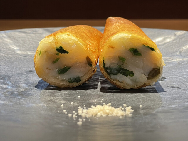 毎回何が具材か愉しみな春巻きには鮃とあさつきで、