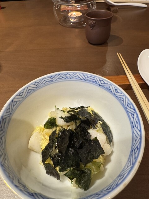 テーブルチェックから1ヶ月前くらいに予約して訪問。時間通りに行きましたが、みなさん着席済みです。カウンター6席、通路後ろ奥に2席の配置。なんと、我々は通路後ろ奥の2席しか空いてませんでした。店主の料理の説明は背後から聞くスタイル。。カウンター席予約したはずでしたが。逆カウンターでした。