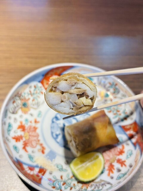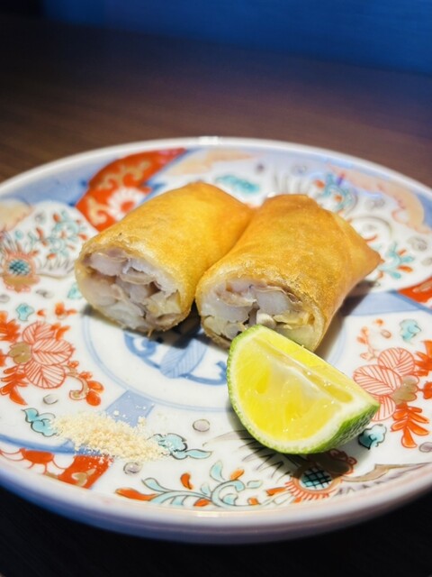 宮城県七ヶ浜で取れた太刀魚とタモギタケの春巻き。塩と酢橘を絞って、あっさりとサクッと美味しく頂きました。