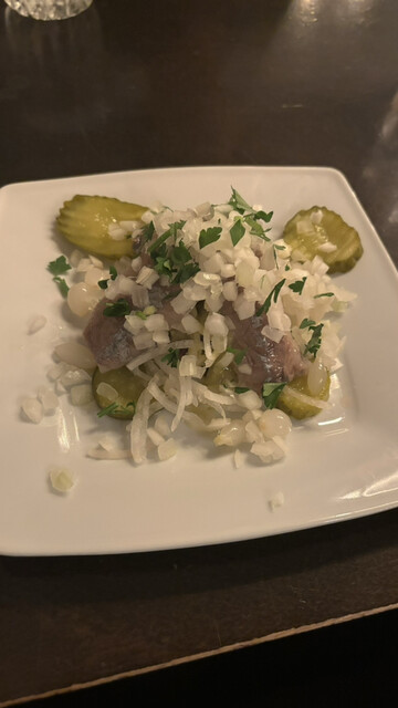 こちらは、オランダ家庭料理を頂けるお店で、コロッケやフレッシュヘリング(Fresh herring)、slavinkenなどのオランダの名物料理をはじめ、これに合わせたワインやビールも幅広く揃っており、大満足のお店でした。
