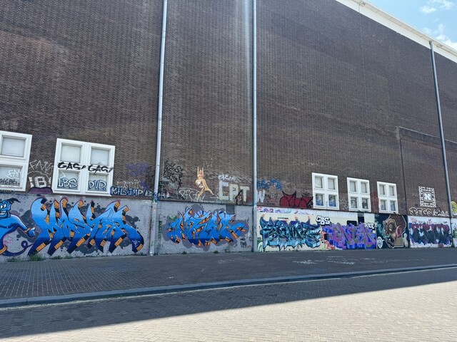 壁や倉庫、コンテナなどに巨大なストリートアートが描かれている所。