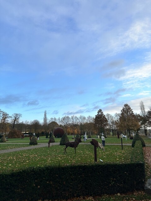 目の前にはかなり大きな芝生の庭が広がっており、アートオブジェが散りばめてあります。